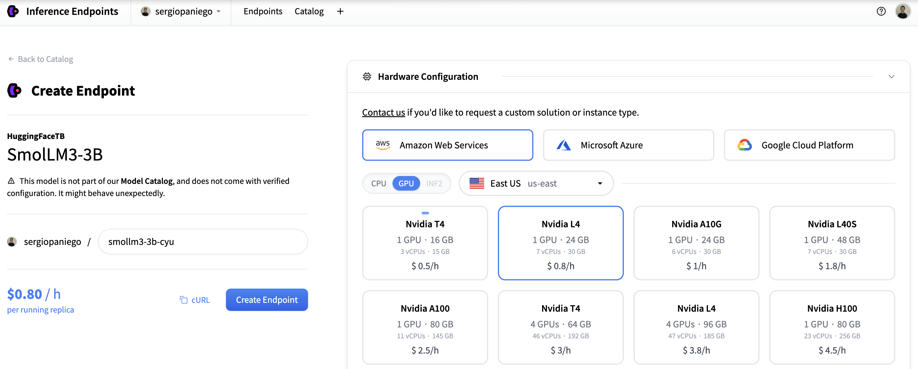 Select the desired model and click Create Endpoint.
